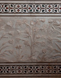 Carved bas relief and inlaid marble. Agra is a popular tourist destination for marble inlaid furniture and other objects. We received a “pillow gift” of coasters and a box, both with marble inlay.