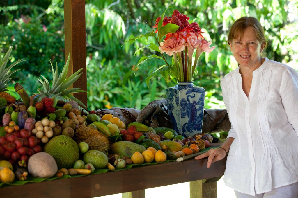Susan Carle with sample of freshly picked fruits