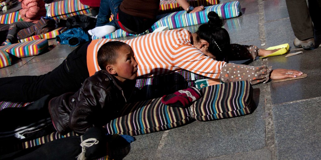 Pilgrim prostrating at Johang Temple praying